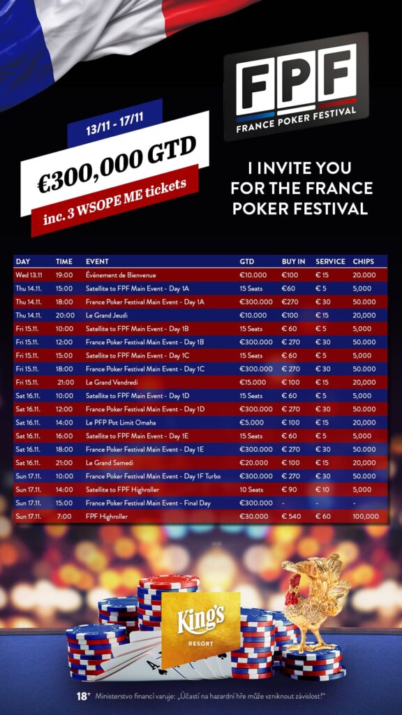 Naast het bekende pokerevenement de Dutch Classics, kun je via Pokerreis ook de rest van het jaar terecht bij het King’s Resort in Rozvadov voor één van de vele mooie pokertoernooiseries die daar worden gespeeld. Het France Poker Festival (13 t/m 17 november) is er zo eentje. Het Main Event kost €300 om te spelen en de prijzenpot is gegarandeerd €300.000 en drie tickets ter waarde van €10.350 voor het WSOP Europe Main Event van 2020. En Pokerreis heeft nu een mooie aanbieding voor die toernooiserie, want voor de prijs van een 4-sterrenkamer krijg je als je snel boekt een 5-sterrenkamer! Één ster bonus, dat klinkt ons als tapis in de oren!*