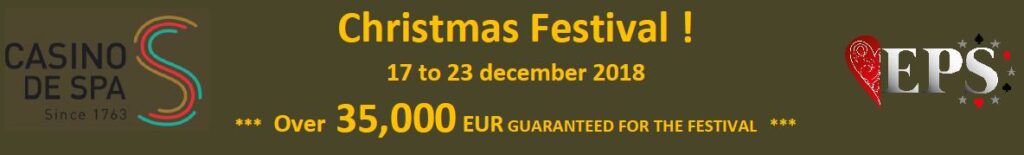 Zo vlak voor de kerstdagen kan er natuurlijk ook in Spa gepokerd worden. Het Christmas Festival garandeert meer dan €35.000 aan prijzengeld, altijd lekker zo net voor de feestdagen om daar wat van mee te pakken natuurlijk. Het €250 Christmas Main Event telt vier startdagen te weten op donderdag 20 december (1A), vrijdag 21 december (1B) en zaterdag 22 december (1C en 1D). Dag 2 is direct de laatste speeldag en deze wordt gehouden op zondag 23 december. In dit Main Event wordt minimaal €25.000 aan prijzengeld uitgekeerd. De blindlevels duren een halfuur (startdagen) en veertig minuten (Dag 2) met een startstack van 50.000.