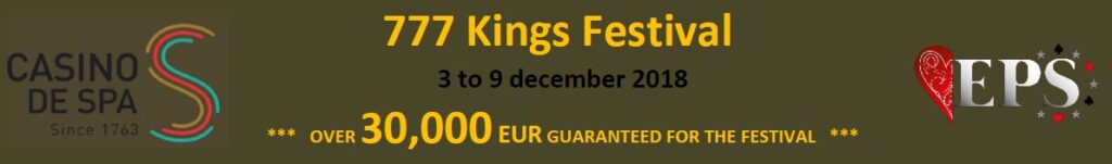 Het 777 Kings Festival begin december garandeert meer dan €30.000 aan uit te keren prijzengeld en zeven dagen vol poker in het Casino de Spa. De blikvanger is het €170 Main Event dat een gegarandeerde prijzenpot van €20.000 heeft. Met startdagen op donderdag 6 december (1A), vrijdag 7 december (1B) en zaterdag 8 december (1C en 1D) is er gelegenheid genoeg om jezelf te plaatsten voor Dag 2 op zondag 9 december wat ook meteen de laatste speeldag van het toernooi is. Met blindlevels van een halfuur (startdagen) en veertig minuten (Dag 2) bij een startstack van 50.000 in chips ook in dit Main Event lekker wat speelruimte. Re-enteren kan onbeperkt de eerste tien blindlevels per startdag.