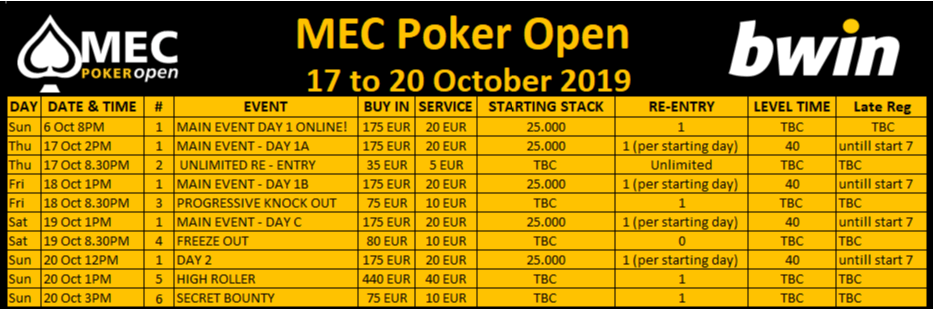 De Mec Poker Open keert in oktober terug naar het casino van Spa voor de derde editie en die zal plaatsvinden van 17 tot 20 oktober. Het Main Event zal ook deze keer een buy-in hebben van € 175. Donderdag, vrijdag en zaterdag zijn de drie startdagen die steeds om 13 uur zullen aanvangen. Per startdag kan je twee keer inkopen. Beginnen doe je met een stack van 25.000 en de levels zijn veertig minuten lang. Na vijftien levels zit de dag erop en dan ben je zeker van een cash als je nog chips over hebt. Op zondag komen alle spelers terug voor de finale van het toernooi.