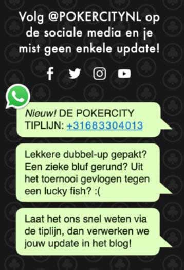 We hebben vandaag natuurlijk ook de PokerCity tiplijn, waarin je al je bad beats, fantastische plays en chipcounts kunt doorgeven! Stuur een whatsappje naar +31683304013 en wij zorgen dat het in het blog terecht komt.