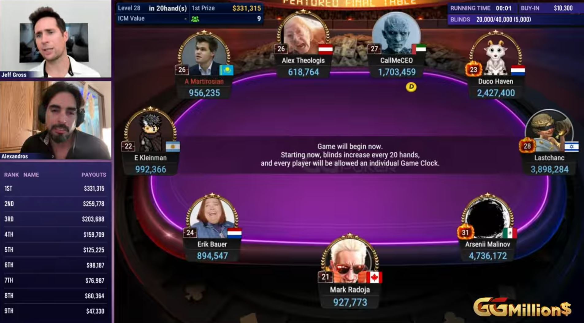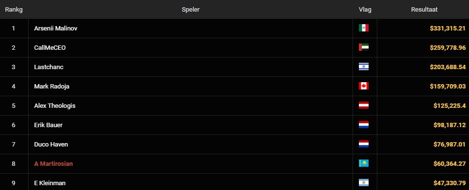 Arsenii Malinov had al langere tijd de touwtjes in handen en maakte het ook af tegen ‘CallMeCEO’. De Russische winnaar, spelend onder de Mexicaanse vlag, streek $331.315 op. De runner-up toucheerde $259.778.