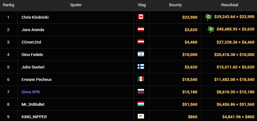 Onze landgenoot pakte een hoger bedrag aan prijzengeld, terwijl de in Canada woonachtige Amerikaan als winnaar uit de bus kwam. Met $39.243+$23.900 pakte hij ook een beduidend meer dollars aan bountyies. Jans Arends streek een mooie $45.485+$3.620 op, een payday richting de $50k.