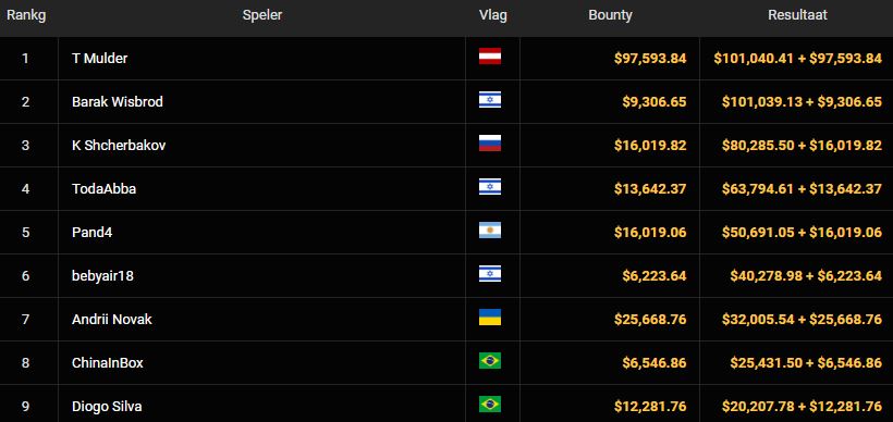 Ook nu trok hij aan het kortste eind en ging Teun Mulder met de zege aan de haal. Met $101.040+$97.593 aan bounties was er een payday richting de twee ton. Barak Wisbrod verdiende met $101.039+$9.306 veel minder aan knock-outs.