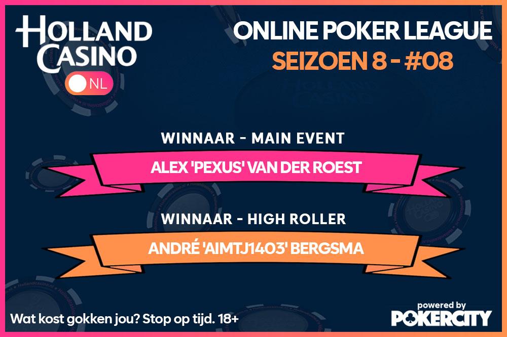 Maandag 3 november was het met HCOPL S8#08 van de Holland Casino Online Poker League tijd voor de achtste speelronde van seizoen 8. In het €20 Main Event ging de titel deze week naar Alex ‘Pexus’ van der Roest á €636. De €55 High Roller werd een prooi voor André ‘aimtj1403’ Bergsma, waarmee hij €910 verdiende. De volgende speelronde van het seizoen staat op maandag 10 november gepland. Wat kost gokken jou? Stop op tijd 18+.