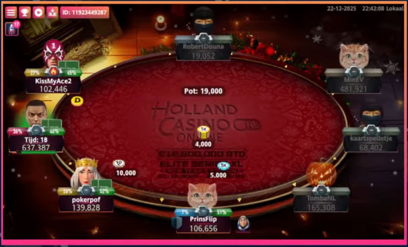 Jan ‘Kluunface’ van Workum (5e, €135) was dan weer sterk back-to-back. Na de derde plek van vorige week eindigde Van Workum dit keer als vijfde. Hij verloor de cruciale flip met aas-boer tegen de pocket vijven van Roshnie ‘Roshnie’ Girdhari.