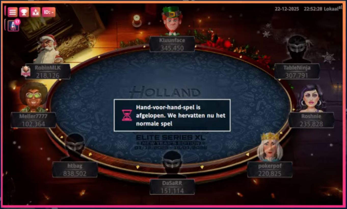 Zeer shorte stuitte Sander ‘DaSaRR’ de Brabander (3e, €294) met nog drie left op de ruime chipleader ‘htbag’. Met 9