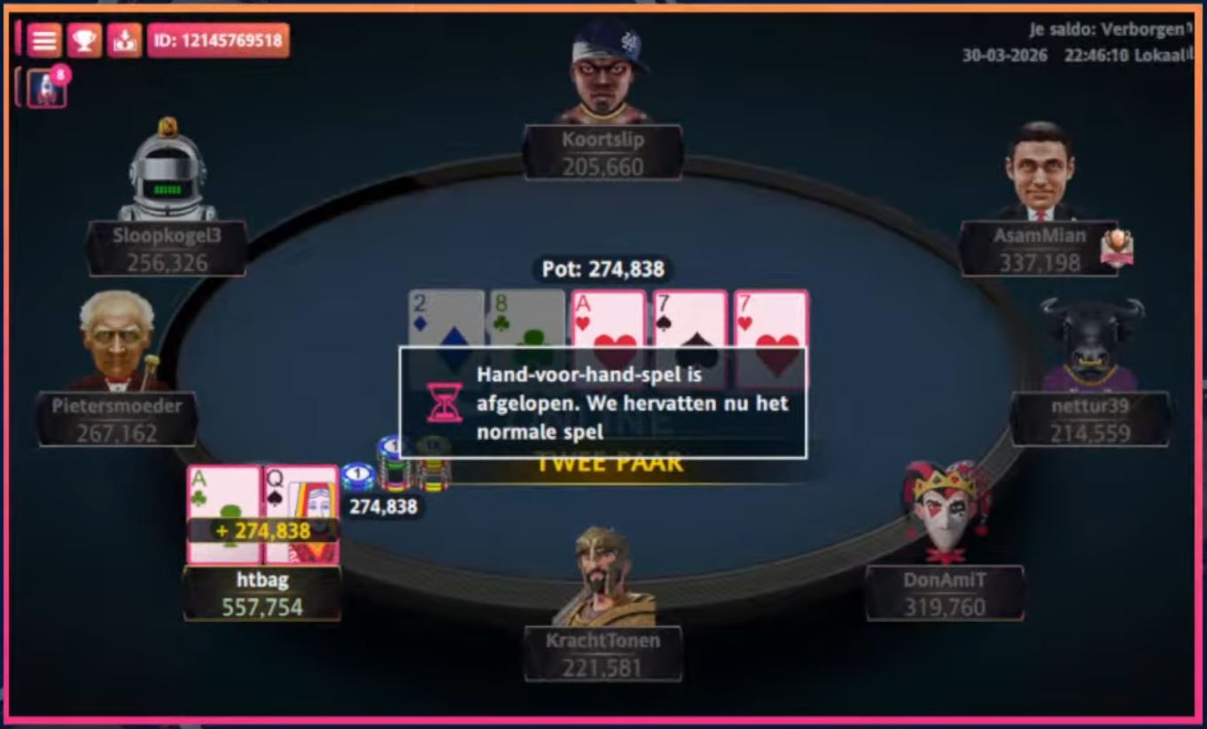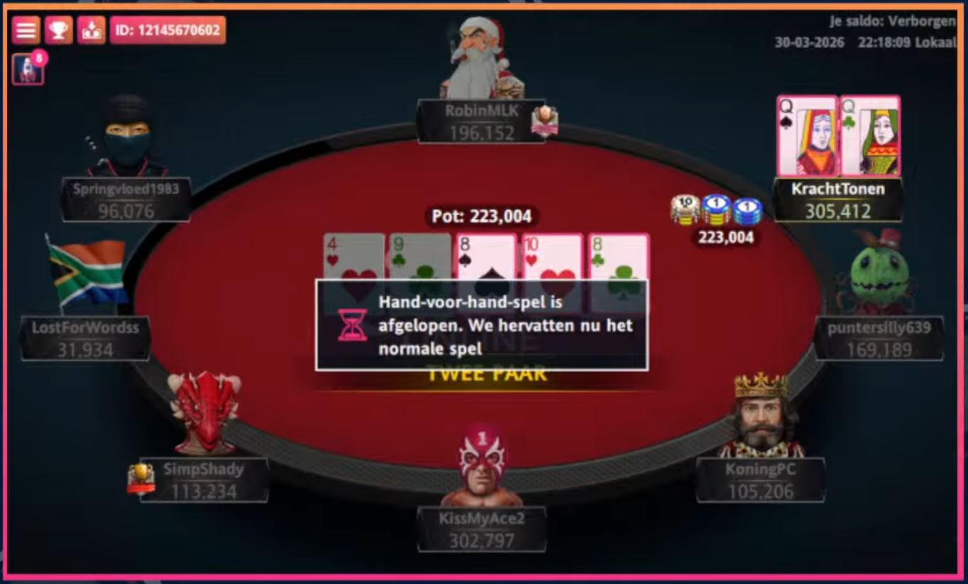 Nadat Daan ‘Pietersmoeder’ van Leeuwen (3e, €303) het momentum leek te hebben, verloor hij vervolgens een aantal belangrijke potten. Zijn laatste chips gingen naar Tim ‘nettur39’ Rutten. Koning-boer legde het af tegen aas-vijf.