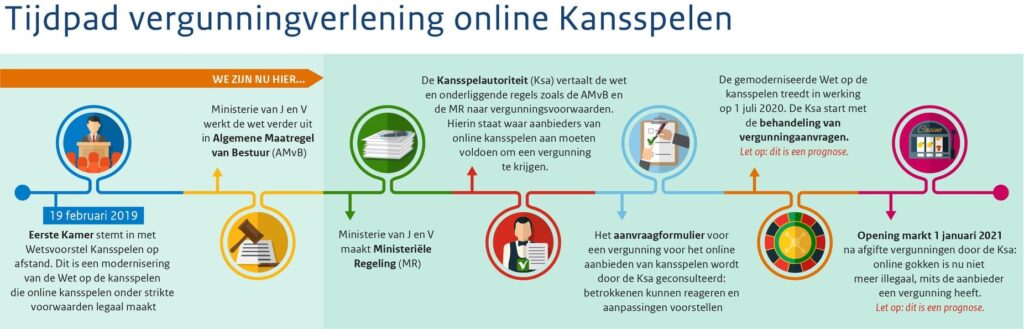 De Ksa is momenteel bezig het vergunningenproces in het kader van de Wet Kansspelen op afstand in te richten. Om dat goed te kunnen doen, is het van belang te weten hoeveel aanvragen zij kan verwachten. Van 5 tot en met 21 juni was het voor partijen mogelijk aan te geven dat zij (mogelijk) van plan zijn een aanvraag in te dienen. De wet wordt waarschijnlijk 1 juli 2020 van kracht. Vanaf dat moment kan de Ksa vergunningsaanvragen in behandeling nemen. De prognose is dat de markt voor online gokken op 1 januari 2021 open kan.