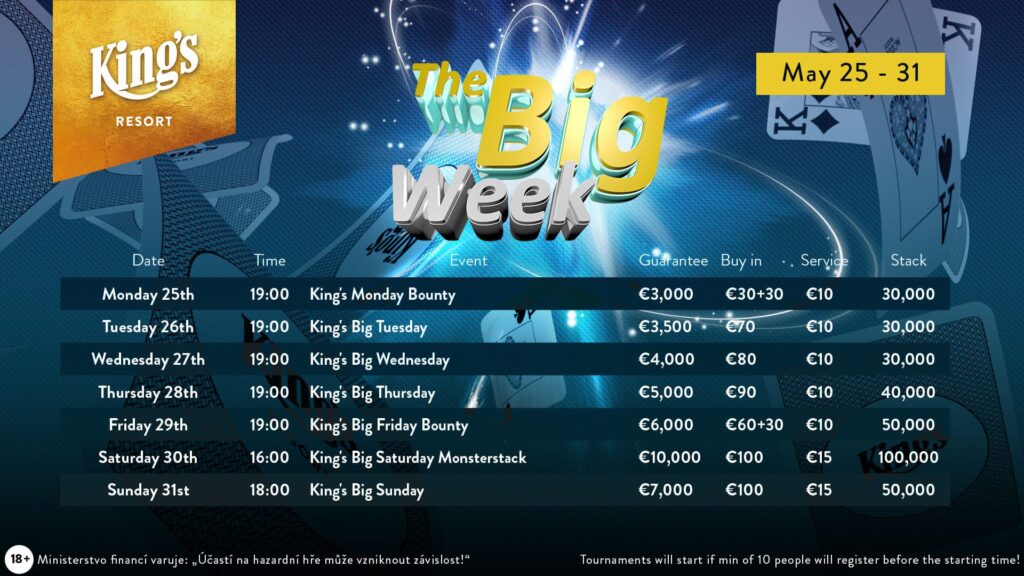 Het King’s Casino in het Tsjechische Rozvadov, bekend van de vele grote pokertoernooien die daar worden gespeeld, opende 11 mei haar deuren alweer nadat het door de coronacrisis ook tijdelijk dicht was geweest. Komende week van 25 t/m 31 mei worden de eerste pokertoernooien gespeeld tijdens ‘The Big Week’ met als hoogtepunt een €100 Monsterstack met €10.000 gegarandeerd in de prijzenpot. Ronald van de Linde van Pokerreis is voorzichtig optimistisch over het al dan niet in iets afgeslankte vorm doorgaan van de Benelux Classics die van 15 t/m 21 juli op de kalender staat.
