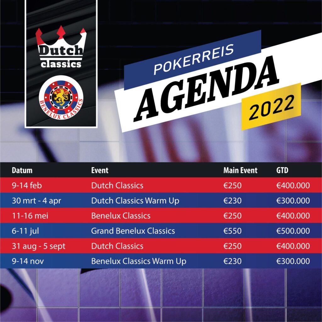 Na de Dutch Classics volgen dit jaar nog de al genoemde Benelux Classics Warm-Up (27 oktober t/m 1 november, €230 Main met €300.000 GTD) en de Grand Benelux Classics (8 t/m 13 december, €550 Main met €500.000 GTD). Dit laatste event in december is een hele speciale, het is namelijk de eerste keer dat er een prijzenpot van een half miljoen euro gegarandeerd is bij een van de events waar Pokerreis aan meewerkt! De buy-in is met €550 wat hoger dan normaal en dit wordt absoluut een knaller! Pokerreis is er trots op hierbij betrokken te zijn en voor het eerst een half miljoen euro gegarandeerd te hebben!