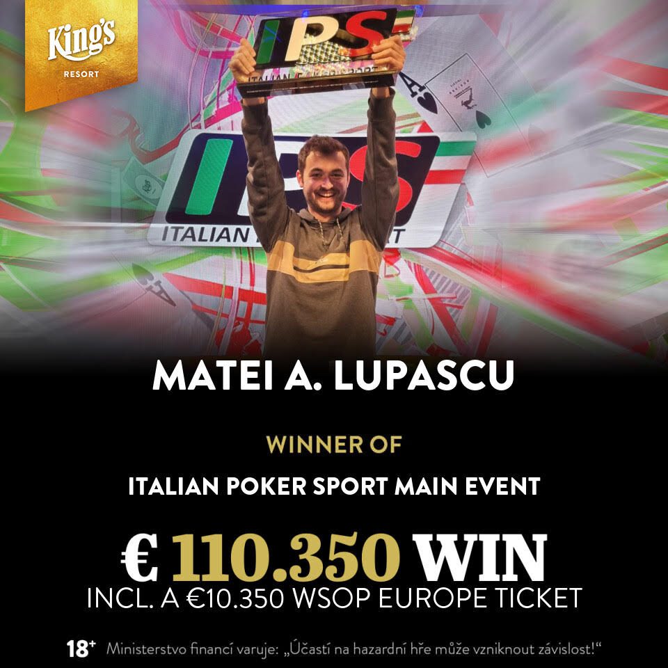 De Roemeen Matei Lupascu heeft het €250 Italian Poker Sport Main Event gewonnen, goed voor €100.000! Beste Belg was Jean Pol Nicolas op de achtste plek, goed voor €9.447. De Nederlanders kwamen niet verder dan een 35e plek voor ‘Blackpanter’. De komende weken staan mooie events op het programma met de European Poker Days (6 t/m 10 oktober) en de German Poker Days (14 t/m 18 oktober). Wil er een keer bij zijn in het King’s Casino in Rozvadov? Boek dan je verblijf via onze partner Kennemer Reizen / Pokerreis en je bent verzekerd van het beste verblijf in het pokerwalhalla van Europa!