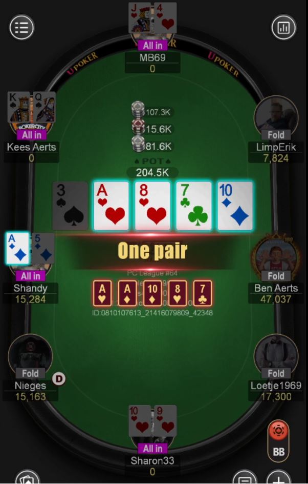 Na drie limpers callde Bart ook vanuit de small blind, waarna Kees er 5.200 van maakte vanuit de big blind. Drie spelers callden dat, waarop Bart verrassend all-in ging vanuit small blind. Kees geloofde er niets van en ging ook all-in, waarna ook Mato Bozic en Sharon van Rhenen in het diepe sprongen met nog een re-entry achter de hand: