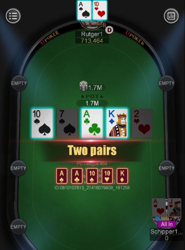 De heads-up ging tussen John ‘Schipper1958’ Schot (2e) en Rutger ‘Rutger1’ van Faassen (1e). Die waren er in welgeteld één handje uit! Preflop ging alles naar het midden en de pokergoden besloten dat het de avond van Rutger was, die hulp vond met de mindere hand: