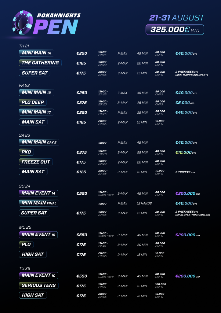 - €250 Mini Main: van 21 tot 24 augustus, €40.000 GTD. Een unieke, diepe 7-max structuur;