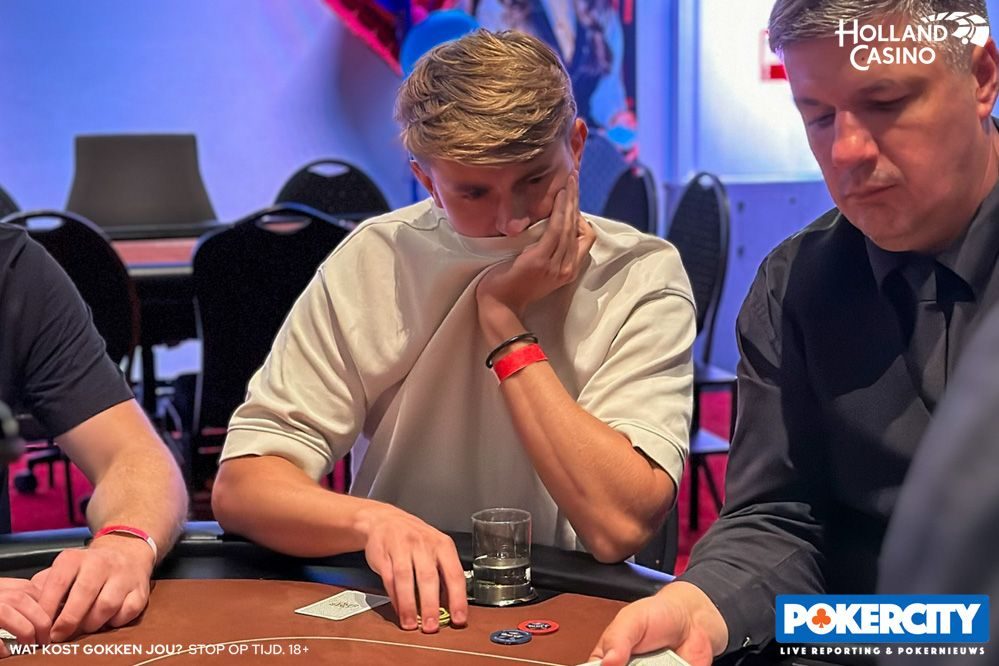 Under the gun+1 opende Kees van Brugge de actie naar 20.000. Zijn linkerbuurman Stefan Leenen besloot te callen. Daar weer twee posities achter schoof de shorte Pel Nieuwenhuis all-in voor zijn laatste 90.000. Van Brugge ging mee, Leenen kneep ertussenuit.