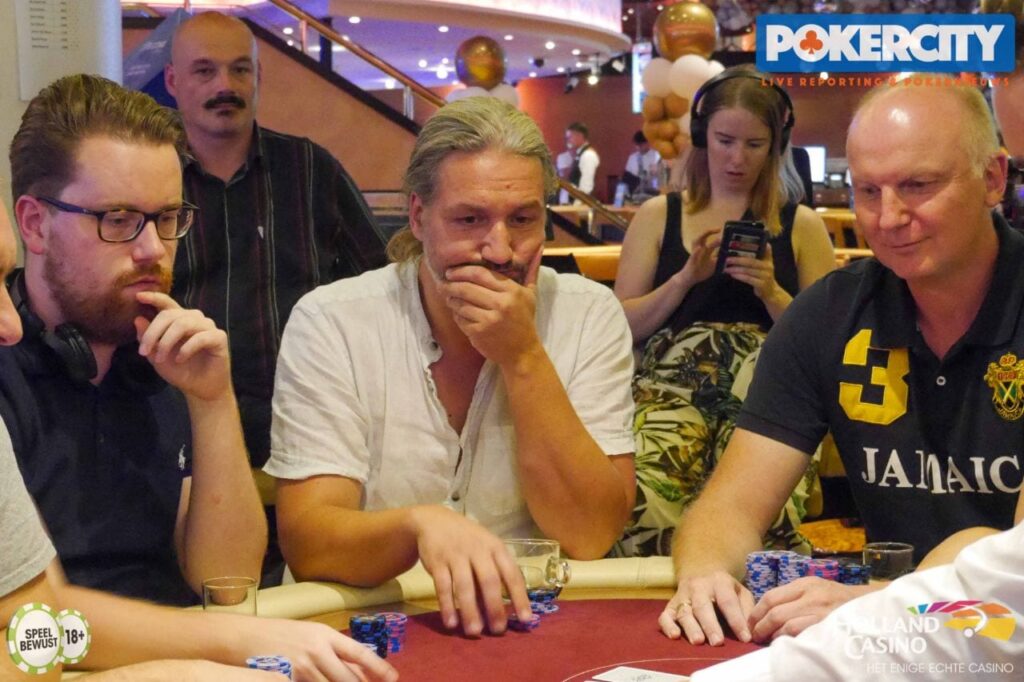 In het vervolg vond Leo Vermeer een dubbel-up met aas-tien tegen de boeren van Marc Bonke, waardoor laatstgenoemde short raakte en ook Bo Hoebe (6e, €5.158) kwam in de problemen. Hij leverde zijn klein geworden stack in bij Mondelaars met Q