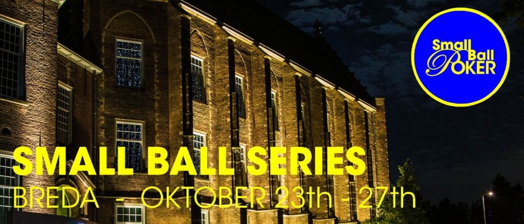 Van 23 t/m 27 oktober is de serie voor de kleine bankroll er weer! De Small Ball Series keert terug naar Breda met een €200 Main Event met drie startdagen. Verder zijn er maar liefst vijf side events met ongeveer dezelfde buy-in én een €450 Progressive Bounty High Roller. Vorig jaar won Michael Rijnen (foto onder) het Main Event in de kapel. Hij ging er na een deal met €8.500 vandoor en de titel. Wie wordt de volgende Small Ball kampioen van Breda?