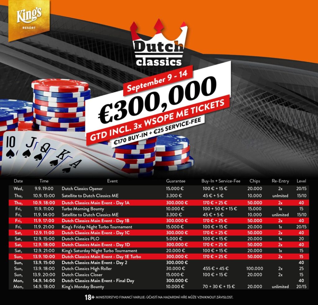 Het beproefde concept van de Dutch Classics staat al jaren als een huis, dus daar is weinig aan gesleuteld. Een mooie mix aan side events gecombineerd met de vele cashgames en natuurlijk een groot Main Event met een schappelijke buy-in van €195 en een grote gegarandeerde prijzenpot van €300.000! Het Main Event kent vijf startdagen, startend op donderdag 10 september en de laatste kans is een turbo op de zondagochtend 13 september voor de start van Dag 2 op zondagmiddag. De ontknoping volgt op maandag 14 september.Het complete speelschema check je hieronder: