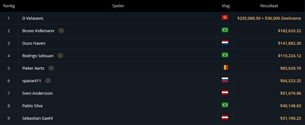 echter two pair gemaakt en callde af. Net als vorige week dus het brons voor Ten Haven. Met een cash van $141.882 kende hij wederom een uitstekende payday. Velasevic shipte het toernooi vervolgens á $235.088, voor Bruno Volkmann (2e, $182.633).