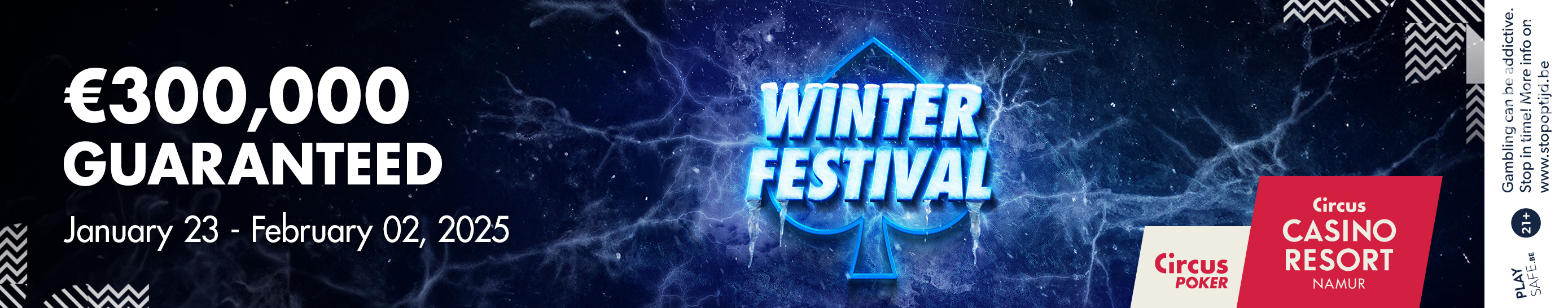 Het Winter Festival Namur 2025 begint donderdag 23 januari! Dit is het eerste van twaalf pokerfestivals die in 2025 zullen plaatsvinden in Circus Casino Resort Namur. Het Winter Festival heeft al jaar en dag zijn plats op de kalender met steevast enorm grote velden. In 2025 biedt het festival opnieuw een vol schema met onder andere een €400 Mystery Bounty, een €250 Main Event met een €300.000 gegarandeerde prijzenpot en een €1.100 toernooi. De reeks duurt tot en met 2 februari.
