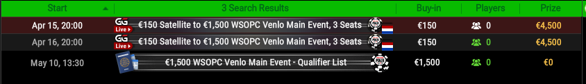 Bij de €150-satellite worden er drie tickets voor het €1.500 WSOPC Venlo Main Event gegarandeerd. Er zijn seats te winnen op de gebruikelijke manier door bij de laatste spelers over te blijven. Het kan ook doordat je via de beginstack van 10.000 de doelstack van 110.000 chips heb gehaald.
